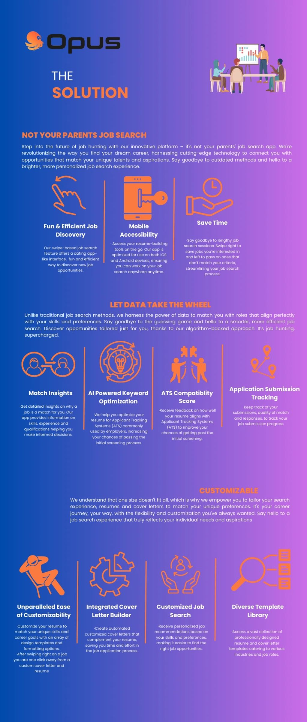 We've taken a fresh and innovative approach to solving and automating the entirety of the job seekers process by creating a user-friendly platform that streamlines resume creation, empowering candidates to showcase their unique skills and experiences. Opus introduces a swipe-based interface that combines ease-of-use with creativity. To empower our users, we harness the power of data-driven insights. Our app continuously analyzes job market trends, employer preferences, and industry-specific requirements, offering you real-time data and recommendations.